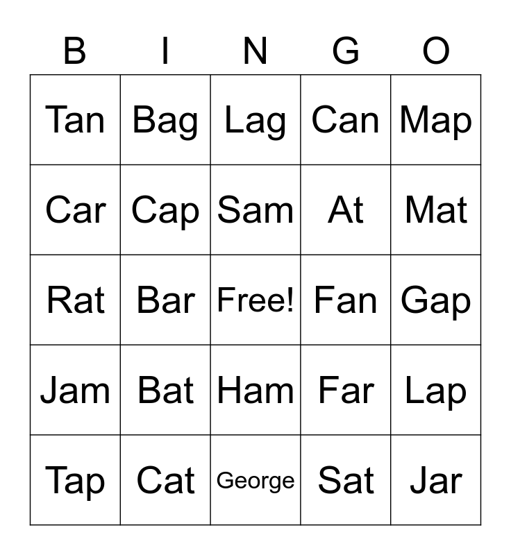 This bingo card has a free space and 24 words: Bat, Cat, Sam, Tap, Map, Tan, Car, Bag, Fan, Ham, At, Rat, Far, Lap, Cap, Sat, Gap, Lag, Mat, Bar, Jar, Jam, Can and George.