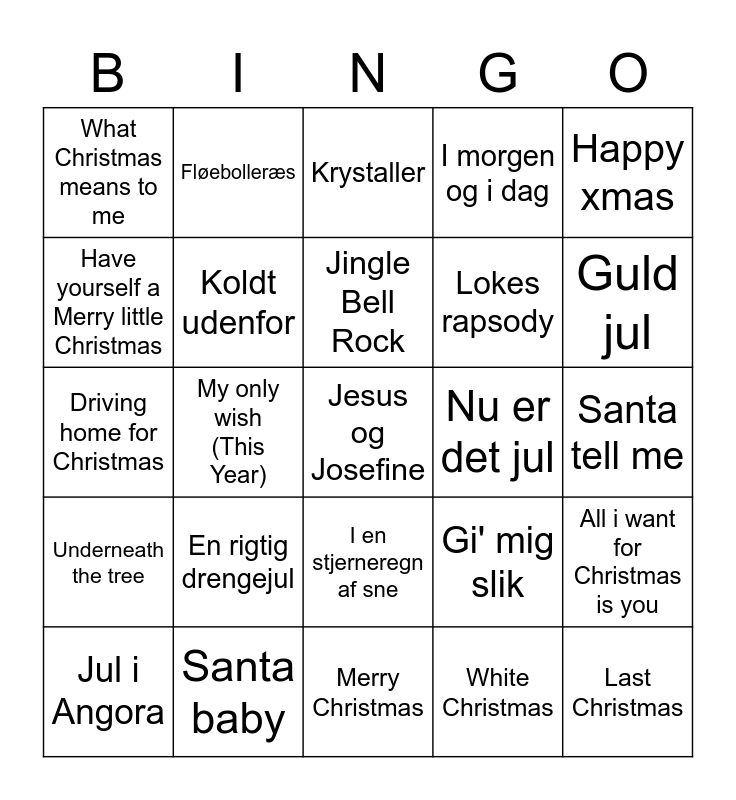 This bingo card has a free space and 49 words: Cool Jul, Last Christmas, Mistletoe, Merry Christmas, En rigtig drengejul, Merry Christmas Everyone, Fløebolleræs, Let love be love, Have yourself a Merry little Christmas, Drømte mig en en lille drøm, Koldt udenfor, I morgen og i dag, All i want for Christmas is you, Gi' mig slik, Pagten, Santa Claus is coming to town, Jingle Bell Rock, Nu er det jul, Muligvisvej, Happy xmas, My only wish (This Year), White Christmas, What Christmas means to me, Lokes rapsody, Its beginning to look a lot like Christmas, Guld jul, Jul i Angora, Jul i Krummeland, I en stjerneregn af sne, Underneath the tree, Tag mig med, Jul det'cool, Let it snow! Let it snow! Let it snow!, Feliz Navidad, Santa baby, Stjernestøv, Rockin around the Christmas tree, Rudolf med den røde tud, Santa tell me, Julebal i nisseland, Søren Banjomus, Tinka, Vi er på vej til dig - Julemand, Tidsrejsen, Driving home for Christmas, Krystaller, Snowman, Kongespil and Jul i Valhal.