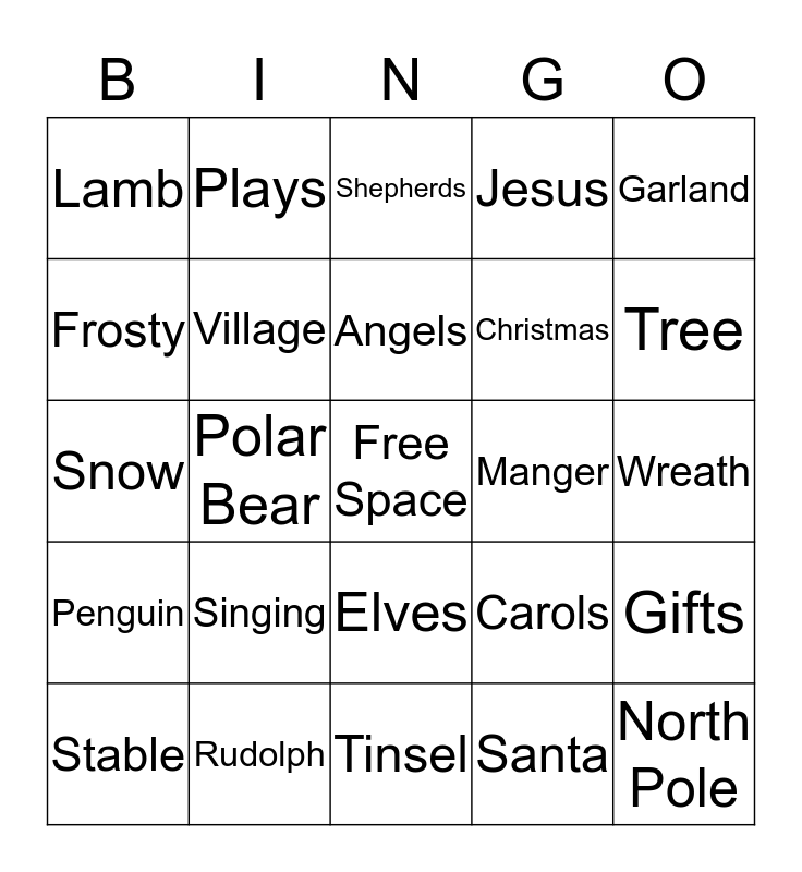 This bingo card has a free space and 24 words: Singing, Rudolph, Angels, Stable, Garland, Lamb, Frosty, Plays, Manger, Elves, Christmas, Snow, Carols, Gifts, Village, Santa, Wreath, Shepherds, Tree, Polar Bear, North Pole, Penguin, Jesus and Tinsel.