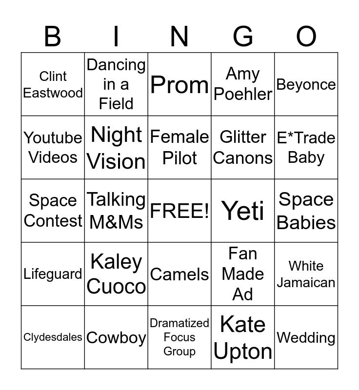 This bingo card has a free space and 24 words: Kaley Cuoco, Cowboy, Female Pilot, Clydesdales, Beyonce, Clint Eastwood, Youtube Videos, Dancing in a Field, Yeti, Camels, Glitter Canons, Space Contest, Fan Made Ad, White Jamaican, Night Vision, Kate Upton, Space Babies, Prom, E*Trade Baby, Talking M&Ms, Wedding, Lifeguard, Amy Poehler and Dramatized Focus Group.