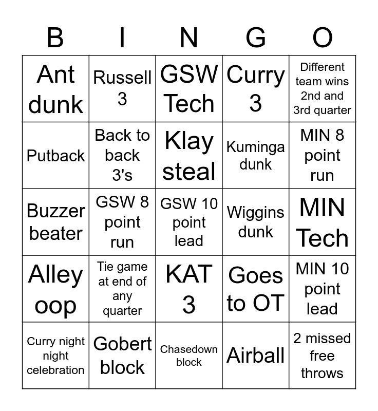 This bingo card has 25 words: Tie game at end of any quarter, Chasedown block, Klay steal, Curry night night celebration, Different team wins 2nd and 3rd quarter, Ant dunk, Putback, Russell 3, Wiggins dunk, KAT 3, Kuminga dunk, Buzzer beater, Goes to OT, MIN 10 point lead, Back to back 3's, 2 missed free throws, MIN Tech, GSW Tech, MIN 8 point run, GSW 8 point run, GSW 10 point lead, Gobert block, Alley oop, Curry 3 and Airball.