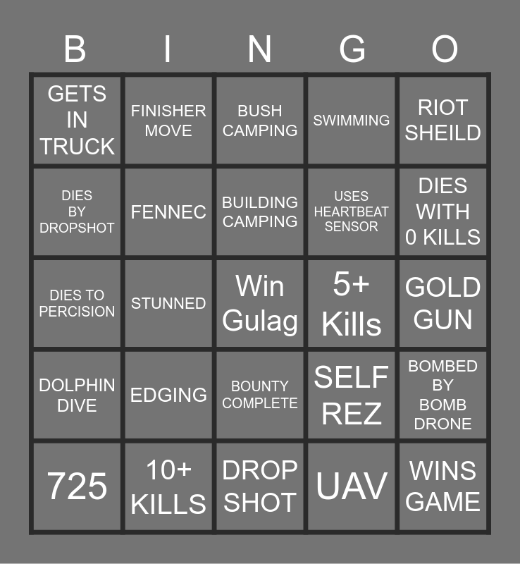 This bingo card has a free space and 34 words: BM, UAV, FLASHED, SUICIDE, DOLPHIN DIVE, FENNEC, RIOT SHEILD, 725, FINISHER MOVE, TTV/TK, BUILDING CAMPING, BUSH CAMPING, AFK, DIES IN 10 SECONDS, 5+ Kills, DIES WITH 0 KILLS, 10+ KILLS, DIES TO PERCISION, EDGING, SELF REZ, BOUNTY COMPLETE, SNIPER KILL, GETS IN TRUCK, GOLD GUN, DROP SHOT, WINS GAME, SWIMMING, HAS JAPANESE NAME, USES HEARTBEAT SENSOR, DIES BY DROPSHOT, HORRIBLE AIM, STUNNED, BOMBED BY BOMB DRONE and GETS IN WARTHOG.