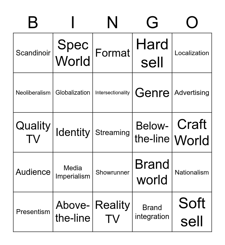 This bingo card has 25 words: Media Imperialism, Reality TV, Intersectionality, Presentism, Localization, Scandinoir, Neoliberalism, Spec World, Below-the-line, Showrunner, Genre, Quality TV, Brand world, Nationalism, Globalization, Soft sell, Craft World, Format, Advertising, Identity, Streaming, Above-the-line, Audience, Hard sell and Brand integration.