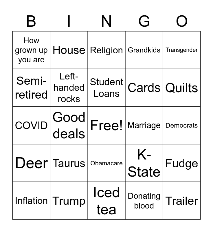 This bingo card has a free space and 24 words: Taurus, Trump, Student Loans, Inflation, Transgender, How grown up you are, Semi-retired, House, Marriage, Obamacare, Cards, COVID, K-State, Fudge, Left-handed rocks, Donating blood, Democrats, Religion, Quilts, Good deals, Trailer, Deer, Grandkids and Iced tea.