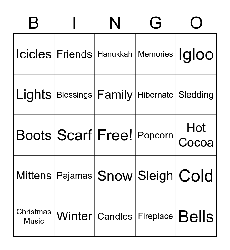 This bingo card has a free space and 26 words: Snow, Fireplace, Family, Winter, Igloo, Icicles, Lights, Friends, Hot Cocoa, Sleigh, Hibernate, Boots, Cold, Christmas Music, Scarf, Kwanza, Memories, Mittens, Hanukkah, Bells, Sledding, Candles, Popcorn, Pajamas, Blessings and Skating.
