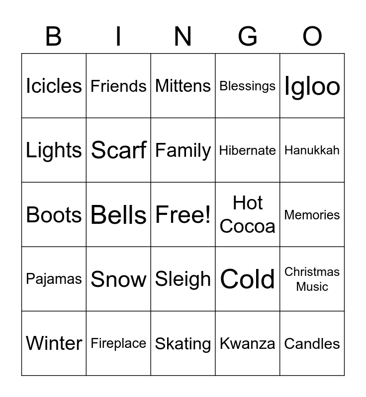 This bingo card has a free space and 24 words: Snow, Fireplace, Family, Winter, Igloo, Icicles, Lights, Friends, Hot Cocoa, Sleigh, Hibernate, Boots, Cold, Christmas Music, Scarf, Kwanza, Memories, Mittens, Hanukkah, Bells, Candles, Pajamas, Blessings and Skating.