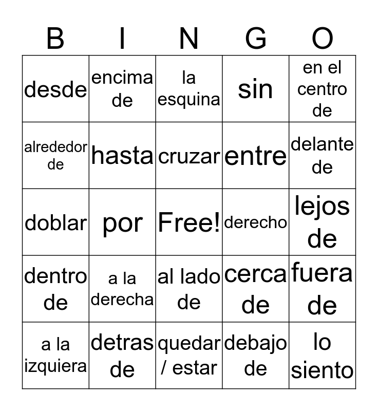 This bingo card has a free space and 24 words: a la derecha, detras de, cruzar, a la izquiera, en el centro de, desde, alrededor de, encima de, derecho, al lado de, entre, doblar, cerca de, fuera de, hasta, debajo de, lejos de, la esquina, delante de, por, lo siento, dentro de, sin and quedar / estar.