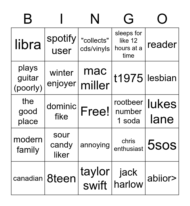 This bingo card has a free space and 24 words: sour candy liker, 8teen, mac miller, canadian, reader, libra, plays guitar (poorly), spotify user, rootbeer number 1 soda, annoying, t1975, the good place, chris enthusiast, 5sos, winter enjoyer, jack harlow, lukes lane, "collects" cds/vinyls, lesbian, dominic fike, abiior>, modern family, sleeps for like 12 hours at a time and taylor swift.