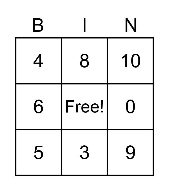 This bingo card has a free space and 11 words: 1, 3, 9, 5, 8, 10, 0, 2, 6, 4 and 7.