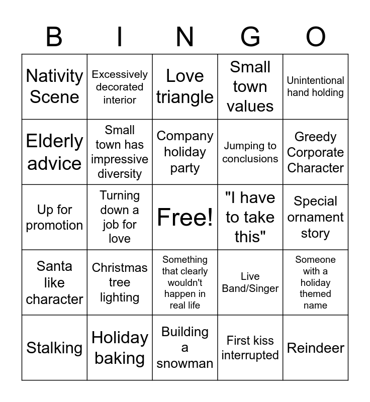 This bingo card has a free space and 86 words: Town Christmas Festival, Awkward Proposal, Something that clearly wouldn't happen in real life, Anti-Christmas character, Horse drawn carriage or sleigh ride, Workaholic, Ice Skating, Impromptu snowball fight, Christmas PJs, Single Parent, Main characters "bump into" each other in the beginning, Trying to come clean and gets interupted, Someone with a holiday themed name, Special ornament story, Ridiculously convenient mistletoe, Company holiday party, Made up town or country, Gets dumped in beginning of movie, Terribly bad fake CGI snow, Someone spending holiday in the tropics, Family property or business in trouble, Dating obviously wrong person, Up for promotion, Christmas Caroling, First kiss interrupted, Ugly sweater, Childhood sweethearts, From a small town, Secretly royal, Sneaking around, Holiday baking, Cookie Decorating, Christmas tree decorating, Christmas tree lighting, Elderly advice, Lives in place they clearly can't afford, Greedy Corporate Character, Christmas tree shopping, Family member deceased, Turning down a job for love, Children's christmas play or pageant, "My hands are tied" or "It's out of my hands", Gift Wrapping, "I have to take this", Coworker is best friend, Unintentional hand holding, Too busy for love, Excessively decorated interior, Putting star or angel on top of christmas tree, Cheesy line that makes you roll your eyes, Car breaks down, Nagging parents, Santa like character, Property as a gift, Crazy Snowstorm that shuts down travel, Drinking hot chocolate, Drinking egg nog, Jumping to conclusions, Small town values, Small town has impressive diversity, Nativity Scene, Cute animal, Handsome single father, Montage, Musical number, Love triangle, Charity or helping homeless, Reindeer, Prince or Princess, Stockings, Poinsetta, Countdown to christmas overlay during movie, Stalking, "Accidental Fall", Dressed inappropriately for weather, Pointlessly shirtless man, Building a snowman, Fired from Job, Town with Christmas themed name, Obvious product placement, Obscure 90's actor, Netflix christmas movie crossover, New York or Chicago, Terrible Soundtrack, Live Band/Singer and Lying about identy.