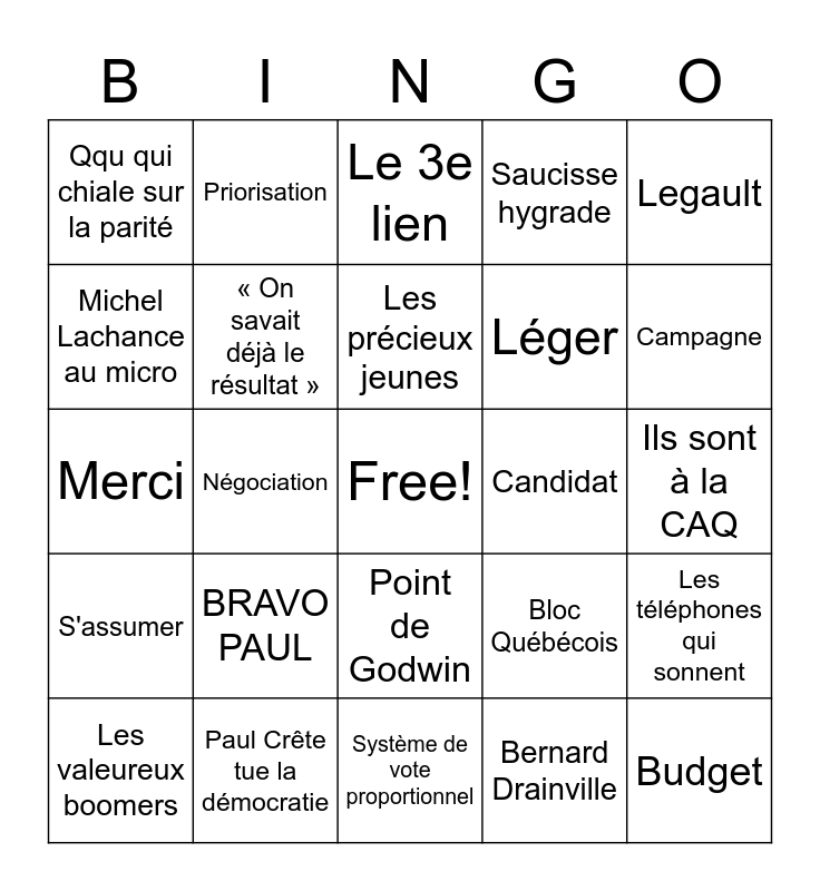 This bingo card has a free space and 30 words: Paul Crête tue la démocratie, Les chèques, Négociation, Pancarte, Qqu qui chiale sur la parité, Le 3e lien, « On savait déjà le résultat », Point de Godwin, Candidat, Système de vote proportionnel, Ils sont à la CAQ, Budget, Bernard Drainville, Le prix du gaz, Campagne, Toucher Paul, Bloc Québécois, S'assumer, BRAVO PAUL, Legault, Merci, Efficience, Priorisation, Léger, Michel Lachance au micro, Saucisse hygrade, Les téléphones qui sonnent, Les valeureux boomers, Les précieux jeunes and Crème glacée et independance.