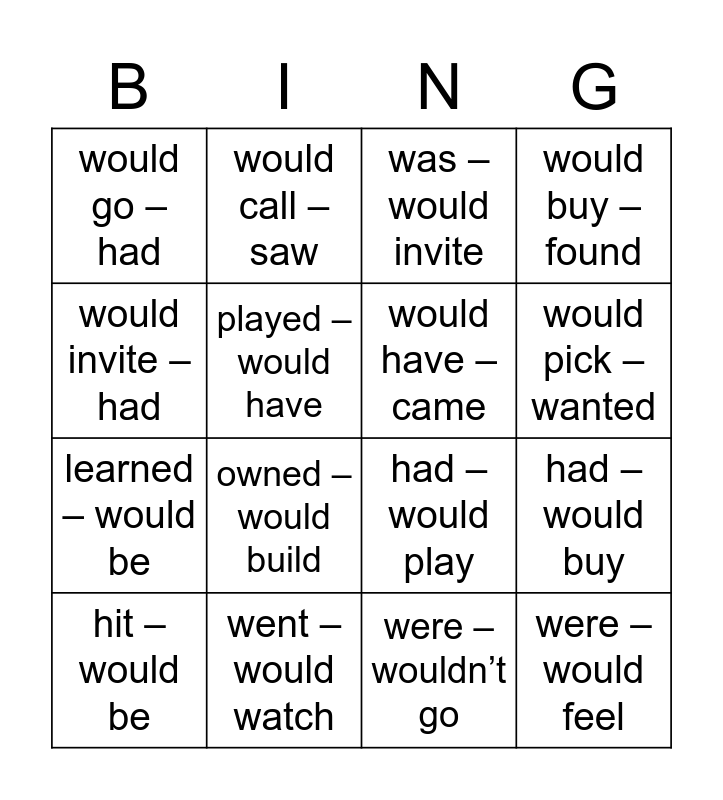This bingo card has 16 words: went – would watch, had – would buy, was – would invite, would go – had, learned – would be, would call – saw, had – would play, were – wouldn’t go, would invite – had, played – would have, hit – would be, would buy – found, owned – would build, would pick – wanted, would have – came and were – would feel.