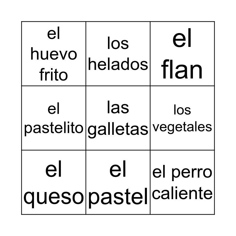 This bingo card has 9 words: el queso, el flan, los helados, el pastelito, el huevo frito, los vegetales, las galletas, el perro caliente and el pastel.