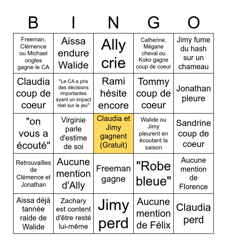 This bingo card has a free space and 34 words: Moment touchant sur l'intimidation, Aucune mention de Félix, Aucune mention de Phil, Aucune mention de Isaac, Retrouvailles de Clémence et Jonathan, "Le CA a pris des décisions importantes ayant un impact réel sur le jeu", Jimy fume du hash sur un chameau, Aissa déjà tannée raide de Walide, Aissa endure Walide, Annonce du nouvel animateur d'OD, Rami hésite encore, Ally crie, Koko pas contente, Aucune mention de Kiana, Walide ou Jimy pleurent en écoutant la saison, Jonathan pleure, Zachary est content d'être resté lui-même, "on vous a écouté", Aucune mention d'Ally, "Robe bleue", Freeman gagne, Mickael gagne CA ou candidat préféré, Freeman, Clémence ou Michael ongles gagne le CA, Sandrine coup de coeur, Jimy perd, Claudia perd, Catherine, Mégane cheval ou Koko gagne coup de coeur, Virginie coup de coeur, Tommy coup de coeur, Claudia coup de coeur, OD prend une pause, Virginie parle d'estime de soi, Aucune mention de Florence and Rami et Sandrine encore ensemble.