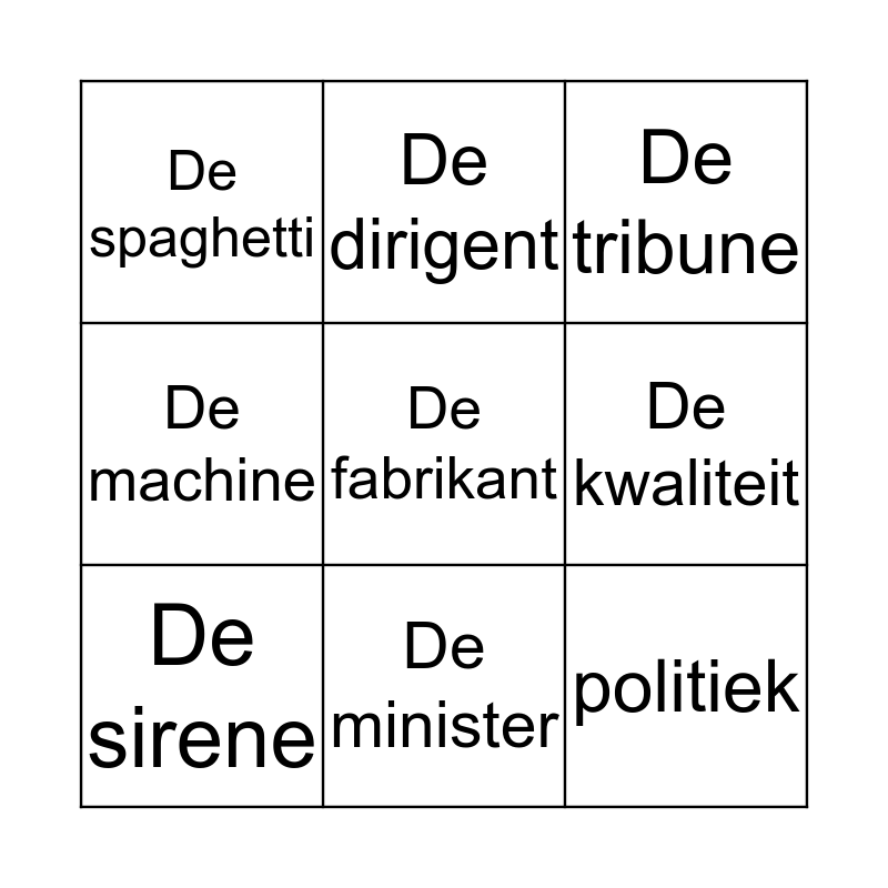 This bingo card has a free space and 8 words: De kwaliteit, De tribune, De dirigent, De sirene, De spaghetti, politiek, De machine and De minister.
