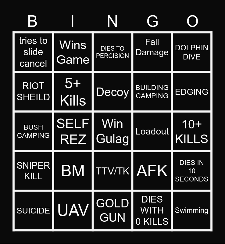 This bingo card has a free space and 24 words: BM, UAV, Decoy, SUICIDE, DOLPHIN DIVE, tries to slide cancel, RIOT SHEILD, Wins Game, Loadout, TTV/TK, BUILDING CAMPING, BUSH CAMPING, AFK, DIES IN 10 SECONDS, 5+ Kills, DIES WITH 0 KILLS, 10+ KILLS, DIES TO PERCISION, EDGING, SELF REZ, Swimming, SNIPER KILL, Fall Damage and GOLD GUN.
