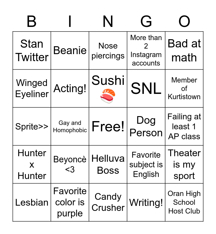 This bingo card has a free space and 24 words: Beyoncè <3, Favorite color is purple, Sushi 🍣, Lesbian, Bad at math, Stan Twitter, Winged Eyeliner, Beanie, Dog Person, Helluva Boss, SNL, Sprite>>, Favorite subject is English, Theater is my sport, Acting!, Writing!, Failing at least 1 AP class, Nose piercings, Member of Kurtistown, Gay and Homophobic, Oran High School Host Club, Hunter x Hunter, More than 2 Instagram accounts and Candy Crusher.