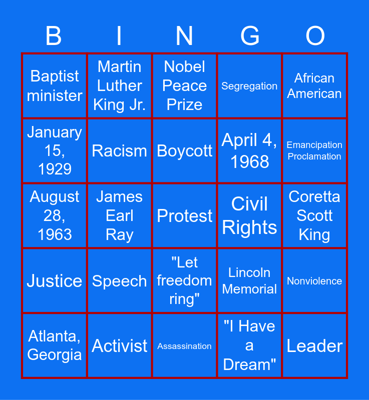 This bingo card has 35 words: "My Country, 'Tis of Thee", Peace, Color, Racism, "Let freedom ring", Segregation, January 15, 1929, "One hundred years later", Boycott, Washington, August 28, 1963, African American, March, Freedom, Baptist minister, Civil Rights, "I Have a Dream", James Earl Ray, Justice, Protest, Lincoln Memorial, Atlanta, Georgia, Nonviolence, Activist, Nobel Peace Prize, Emancipation Proclamation, Leader, Discrimination, April 4, 1968, Coretta Scott King, Liberty, Assassination, Speech, Martin Luther King Jr. and Equality.