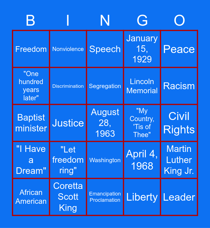 This bingo card has 35 words: Activist, Color, Assassination, Discrimination, Washington, January 15, 1929, "One hundred years later", Protest, Segregation, James Earl Ray, Baptist minister, Peace, March, Atlanta, Georgia, Freedom, "My Country, 'Tis of Thee", Liberty, Justice, "I Have a Dream", August 28, 1963, April 4, 1968, African American, Martin Luther King Jr., Coretta Scott King, Speech, Racism, Leader, Boycott, Lincoln Memorial, Civil Rights, Equality, Emancipation Proclamation, "Let freedom ring", Nonviolence and Nobel Peace Prize.