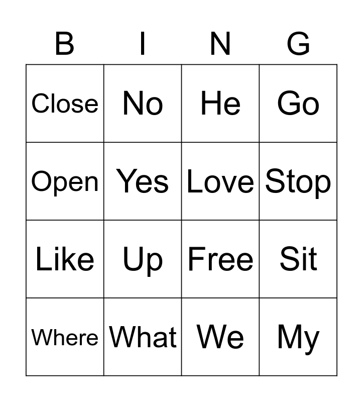This bingo card has 16 words: What, Sit, He, Close, Like, No, Free, We, Open, Yes, Where, Go, Up, Stop, Love and My.