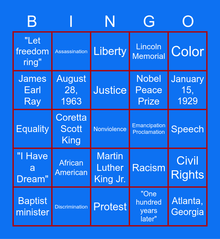 This bingo card has 35 words: Activist, Segregation, April 4, 1968, August 28, 1963, Martin Luther King Jr., Lincoln Memorial, James Earl Ray, Peace, Justice, Freedom, Equality, Color, Boycott, Leader, "Let freedom ring", Emancipation Proclamation, "One hundred years later", Coretta Scott King, "I Have a Dream", Nonviolence, Racism, Baptist minister, Civil Rights, Discrimination, Liberty, January 15, 1929, Atlanta, Georgia, Washington, Nobel Peace Prize, Speech, March, Protest, African American, Assassination and "My Country, 'Tis of Thee".