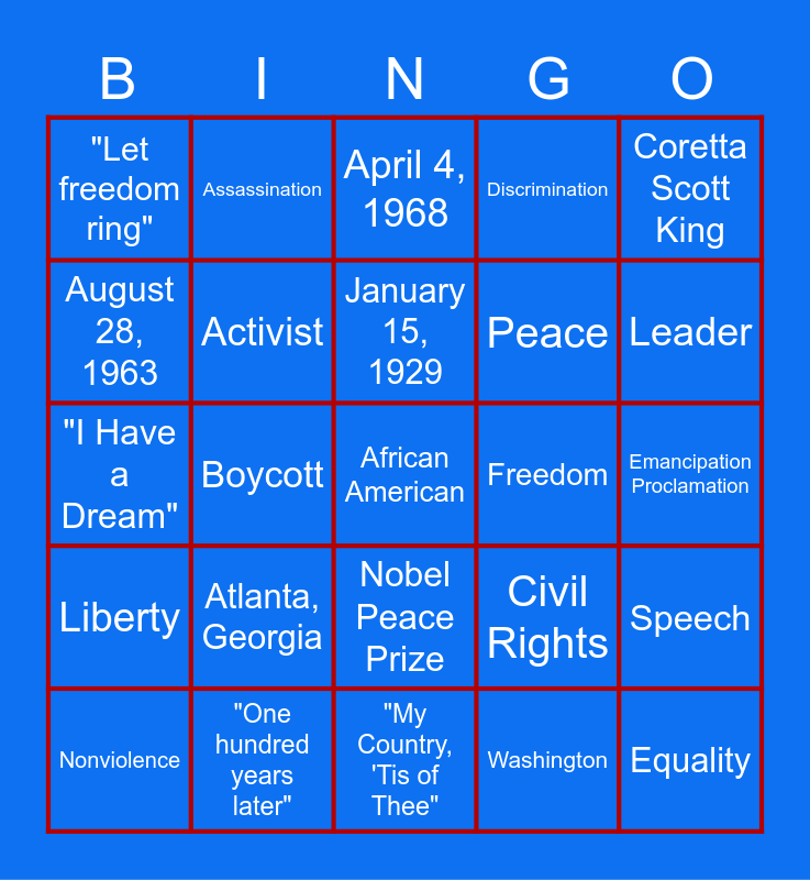 This bingo card has 35 words: Protest, Color, Baptist minister, Activist, Nobel Peace Prize, Discrimination, August 28, 1963, March, January 15, 1929, James Earl Ray, "I Have a Dream", Coretta Scott King, Justice, Lincoln Memorial, "Let freedom ring", Freedom, Washington, Boycott, Liberty, African American, Civil Rights, Nonviolence, Speech, "One hundred years later", April 4, 1968, Leader, Equality, Martin Luther King Jr., Peace, Emancipation Proclamation, Segregation, "My Country, 'Tis of Thee", Atlanta, Georgia, Assassination and Racism.