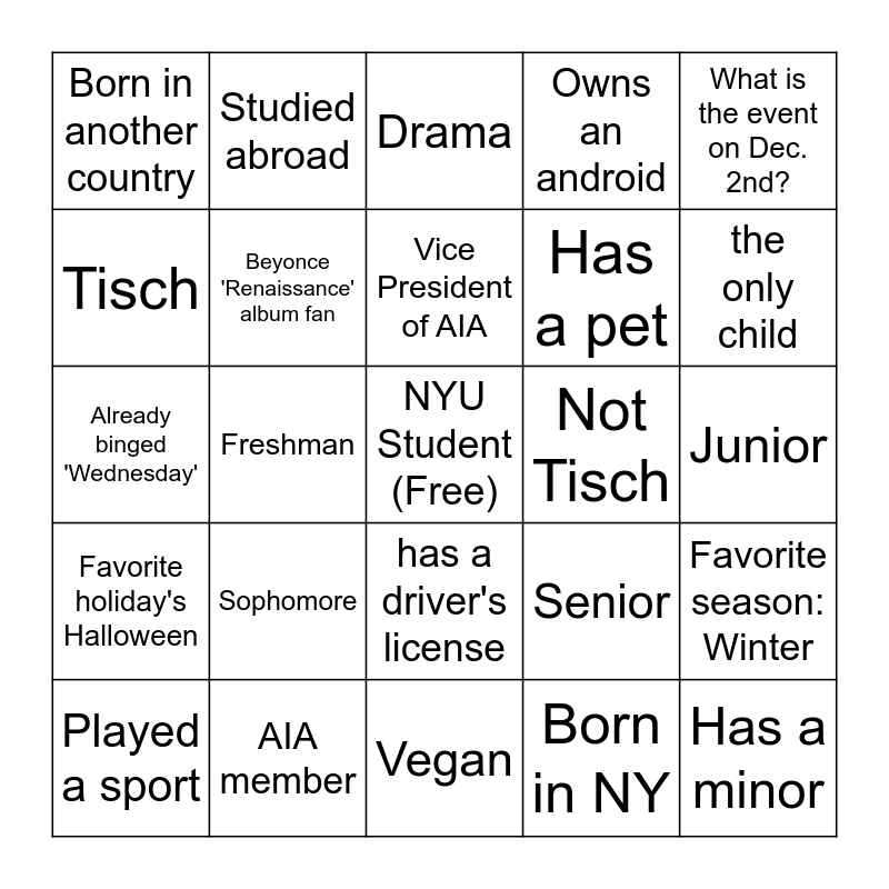 This bingo card has a free space and 24 words: Sophomore, AIA member, Vice President of AIA, Played a sport, What is the event on Dec. 2nd?, Born in another country, Tisch, Studied abroad, Not Tisch, has a driver's license, Has a pet, Already binged 'Wednesday', Senior, Favorite season: Winter, Beyonce 'Renaissance' album fan, Born in NY, Junior, Drama, the only child, Freshman, Has a minor, Favorite holiday's Halloween, Owns an android and Vegan.