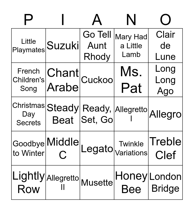 This bingo card has 25 words: Middle C, Musette, Cuckoo, Lightly Row, Clair de Lune, Little Playmates, French Children's Song, Suzuki, Allegretto I, Legato, Ms. Pat, Christmas Day Secrets, Twinkle Variations, Treble Clef, Chant Arabe, London Bridge, Allegro, Go Tell Aunt Rhody, Long Long Ago, Steady Beat, Ready, Set, Go, Allegretto II, Goodbye to Winter, Mary Had a Little Lamb and Honey Bee.
