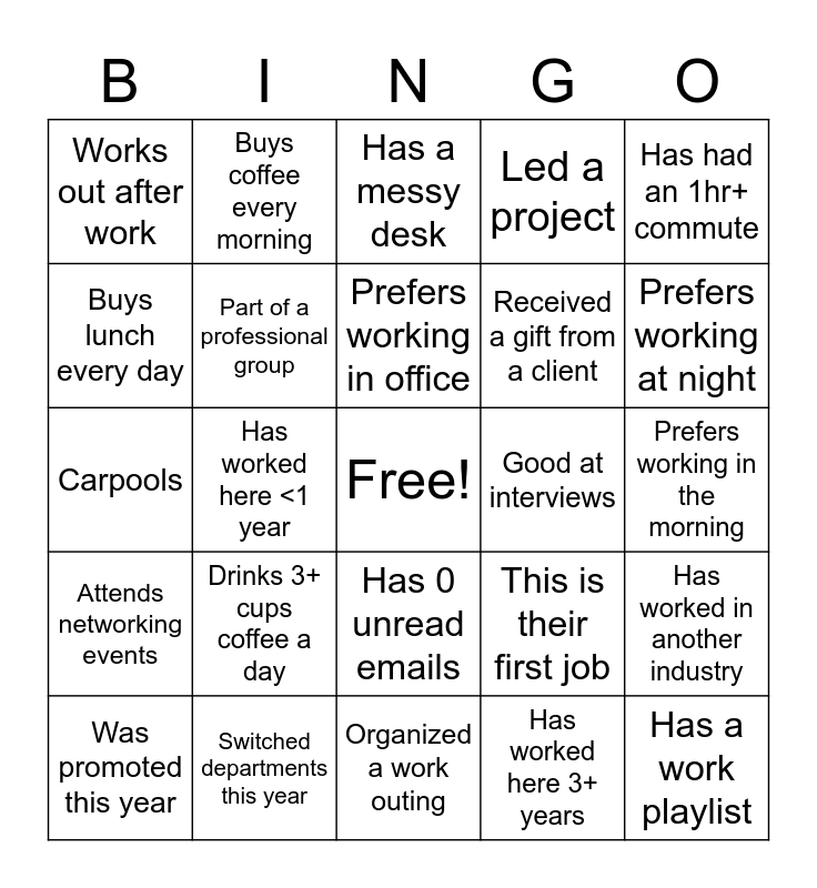This bingo card has a free space and 42 words: Prefers remote work, Prefers working in office, Has a snack stash, Drinks 3+ cups coffee a day, Has worked here 3+ years, Has worked in another industry, Has a work playlist, Has a favorite pen, Has a messy desk, Has 0 unread emails, Prefers working in the morning, Prefers working at night, Has worked here <1 year, Has had an 1hr+ commute, Manager, This is their first job, Bikes to work, Carpools, Runs errands during lunch break, Buys coffee every morning, Buys lunch every day, Played prank on a coworker, Works out before work, Works out after work, Has taken kid to work, Has been employee of the month, Received a gift from a client, Mentioned by name in good review, Was one of the original employees, Worked for a rival company, Mentor, Attends networking events, Part of a professional group, Organized a work outing, Going on vacation soon, Was promoted this year, Switched departments this year, Good at interviews, Bad at interviews, Hired an employee, Led a project and Planned a work party.