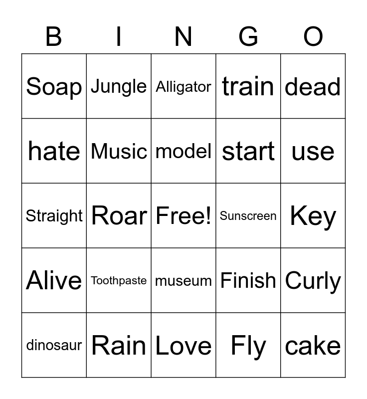 This bingo card has a free space and 39 words: Hammock, Boot, Moon, Music, dinosaur, museum, model, scary, dead, Alive, Roar, train, cake, Key, Sunscreen, Toothpaste, Shampoo, Soap, Towel, Finish, hate, Love, start, use, Want, Soup, Room, read, Write, Jungle, Car, Hippo, Alligator, Rain, Fly, Plane, Curly, Straight and Eraser.