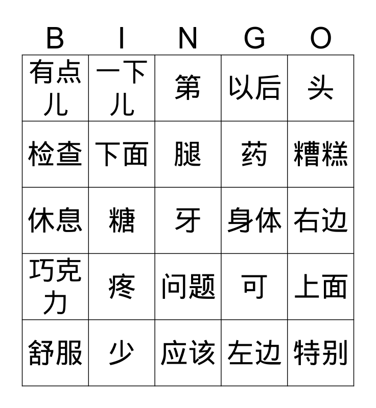 This bingo card has a free space and 24 words: 疼, 少, 腿, 舒服, 头, 有点儿, 检查, 一下儿, 身体, 问题, 药, 休息, 可, 上面, 下面, 左边, 右边, 第, 糟糕, 糖, 特别, 巧克力, 以后 and 应该.