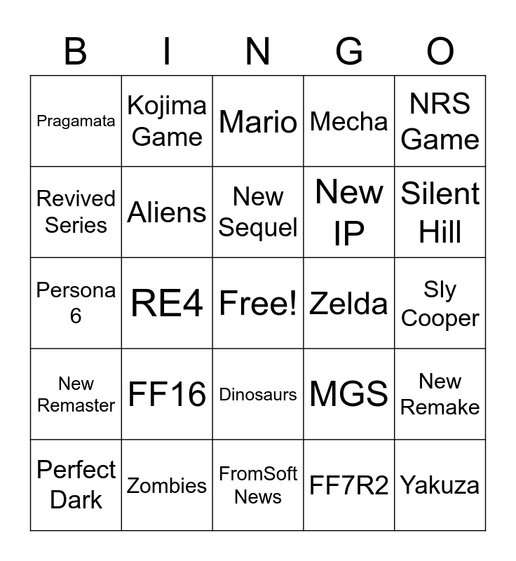 This bingo card has a free space and 24 words: FF16, Zombies, New Sequel, Perfect Dark, NRS Game, Pragamata, Revived Series, Kojima Game, Zelda, Dinosaurs, New IP, Persona 6, MGS, New Remake, Aliens, FF7R2, Sly Cooper, Mario, Silent Hill, RE4, Yakuza, New Remaster, Mecha and FromSoft News.