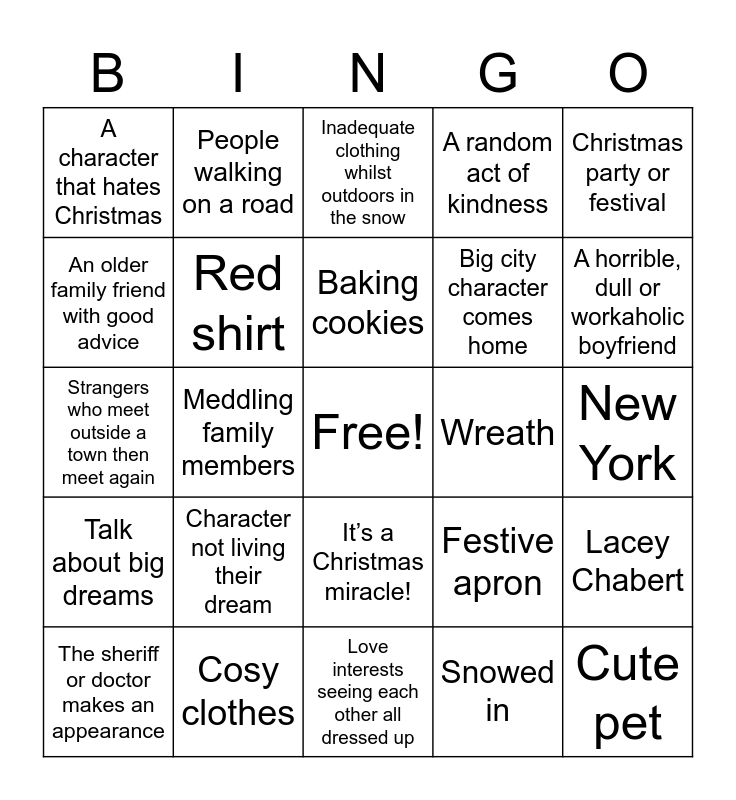 This bingo card has a free space and 95 words: Going home to a small town obsessed with Christmas, Hot chocolate with a candy cane, Snowed in, Running in to an old flame, Making a family recipe, Carols, Terrible acting, Cosy clothes, Snow, Decorating a tree, Chopping down a tree, Workaholic, Making a gingerbread house, Baking cookies, Looking for a Christmas tree, A character that hates Christmas, A horrible, dull or workaholic boyfriend, Eggnog, Car trouble, Childhood stories being retold, Visiting a coffeeshop, bakery or restaurant, An obvious plotline within 20 minutes, Lighting a tree, An awkward situation, A random act of kindness, An older family friend with good advice, A friend who is playing it straight, Big city character comes home, Character talks about the meaning of Christmas, Someone misunderstands a situation, Character not living their dream, A town with a Christmas like name, People coming together to save the day, A town in trouble, The sheriff or doctor makes an appearance, Ice skating, sledding, or skiing, Love interests seeing each other all dressed up, Someone wearing a Santa’s hat, Strangers who meet outside a town then meet again, Mistletoe, Lacey Chabert, Meddling family members, It’s a Christmas miracle!, Christmas party or festival, Festive apron, Wreath, Santa Claus, Trendy scarf, Fake snow, Fireplace, Wrapping presents, Cute little shop, Garland, Love triangle with obvious outcome, Enemies turned lovers, Flannel shirt, Christmas music, Cynic is filled with Christmas spirit, Clumsy fall, Royalty, Red shirt, Christmas crafts, Couple with zero chemistry, Up for a promotion, Must beat a deadline, Christmas ornament, Declaration of love, Nutcracker, Inadequate clothing whilst outdoors in the snow, Use of social media, Cancelled plans, Horrible boss, Cute pet, A call back home to a friend, Zero diversity, Town sign, Meddling parents, Two hands on a mug, Quits job on or before Christmas, People walking on a road, Actual diversity, A big secret, A montage, A made-up country, New York, Talk about big dreams, A complete 180 by a character, A hospital scene, A child plays cupid, Side characters love at first sight, Secret plans, Character is a photographer, writer, or chef, Gender stereotypes, Ugly Christmas sweater and Happy ending.