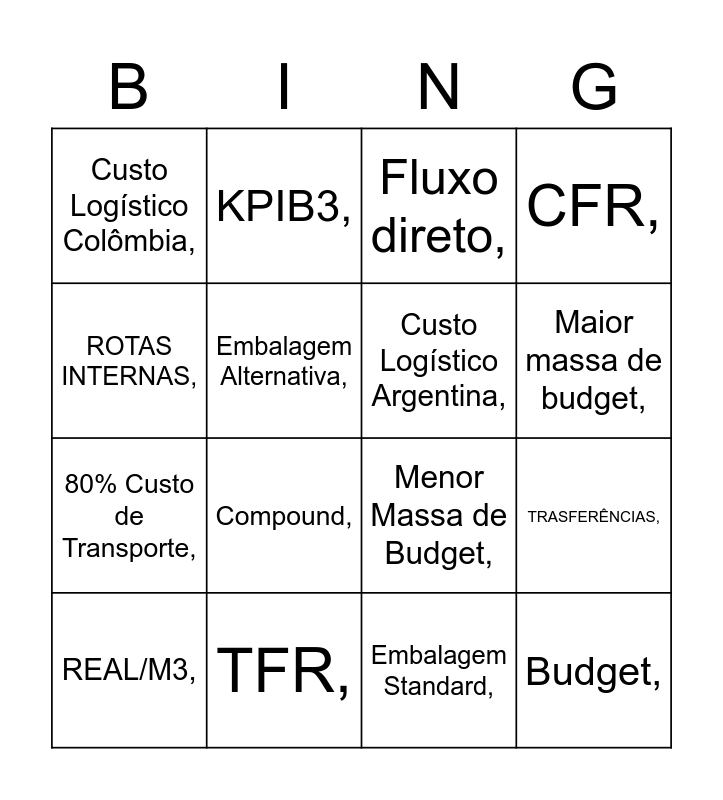 This bingo card has 57 words: AILN,, CRAGEA,, Orçamento de Pessoas,, Custo Logístico Colômbia,, Compra de Etiquetas Exportação,, Retorno de Rack (Importação),, Custo Logístico Argentina,, Aluguel de Armazém,, 80% Custo de Transporte,, TFR,, CFR,, Inbound,, Retorno Rack (Exportação),, POE,, CKD,, CROSS DOCKING,, ROTAS INTERNAS,, TRASFERÊNCIAS,, TAXAS PORTUÁRIAS,, REAL/M3,, TFR,, CFR,, Outbound,, Fluxo direto,, Irregulares,, Maior massa de budget,, Armazenagem Volks,, Nacionalização,, Compound,, 35 Países Clientes,, 61% Custo de Frete Rodoviário,, LTSM,, Balsa,, Embalagens,, Embalagem Standard,, Embalagem Alternativa,, Inventário,, Menor Massa de Budget,, Custos Gerais,, Budget,, KPIB3,, LCPU,, KPI12,, MACRO ECONOMIA,, PERFORMANCE TÉCNICA,, PERFORMANCE ECONOMICA,, DLI,, VTU,, FIP,, PICKING,, ACE,, DEMURRAGE,, FFI,, FIM DE SÉRIE,, DOCUMENTAÇÃO,, DEPANNAGE, and HORS-VT.