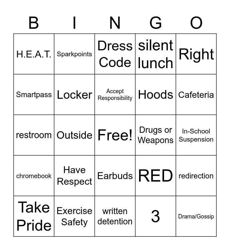 This bingo card has a free space and 24 words: Have Respect, Exercise Safety, Accept Responsibility, Take Pride, Right, H.E.A.T., Smartpass, Sparkpoints, Drugs or Weapons, Earbuds, Hoods, restroom, RED, redirection, Locker, 3, In-School Suspension, Dress Code, Cafeteria, Outside, Drama/Gossip, chromebook, silent lunch and written detention.