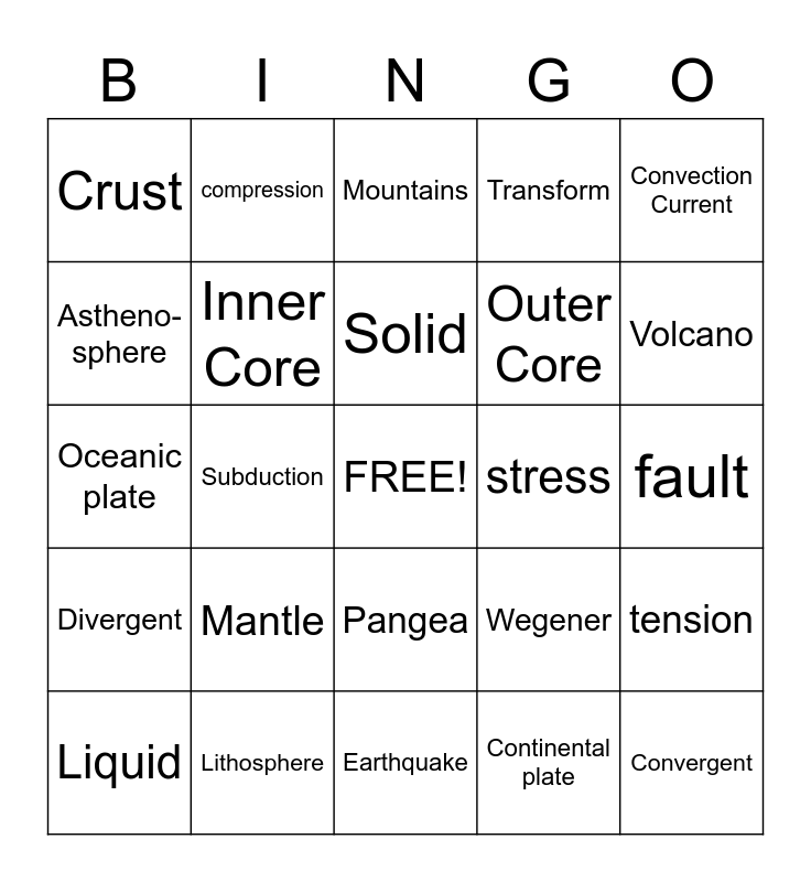 This bingo card has a free space and 24 words: Mantle, Lithosphere, Solid, Liquid, Convection Current, Crust, Astheno-sphere, compression, stress, Pangea, Outer Core, Oceanic plate, Wegener, tension, Inner Core, Continental plate, fault, Mountains, Volcano, Subduction, Convergent, Divergent, Transform and Earthquake.