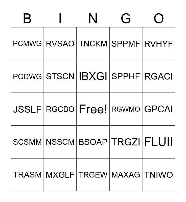 This bingo card has a free space and 86 words: AIRII, ALLBI, BSOAP, CMCCS, CRPCI, CRPII, DALAT, DALDG, DBCDG, ENTRP, ESFOC, FLHII, FLUII, GPCAI, HLSKM, IBXGI, IBXHI, IFSAW, IFSII, IKWCI, INDC, INDOW, JSSLF, KSSCP, MAXAG, MAXLF, MPBLF, MPCMP, MPDMP, MPSMP, MXGLF, NCPNM, NESDM, NSSCM, PCDWG, PCIBN, RGACI, PINLN, RGASI, RGCBO, RGCLK, RGJRT, RGKLF, RGWMO, RVFAO, RVHYF, RVPKM, RVSAO, SBIPM, SBJSM, SBSSM, SBTSM, SCSMM, SCSTT, SPAMO, SPAMP, SPAWM, SPPHF, SPPMF, STSCN, PCMWG, PCDMG, TNMMW, TPKSI, TPFSI, TNCKM, TNDMM, TNIWO, TPNLK, TRGAI, TRGBA, TRGCI, TRASM, TRGCO, TRGCR, TRGDW, TRGEW, TRGHT, TRICT, TRGMN, TRGMO, TRGMW, TRGSI, TRGSO, TRGZI and UDSWN.
