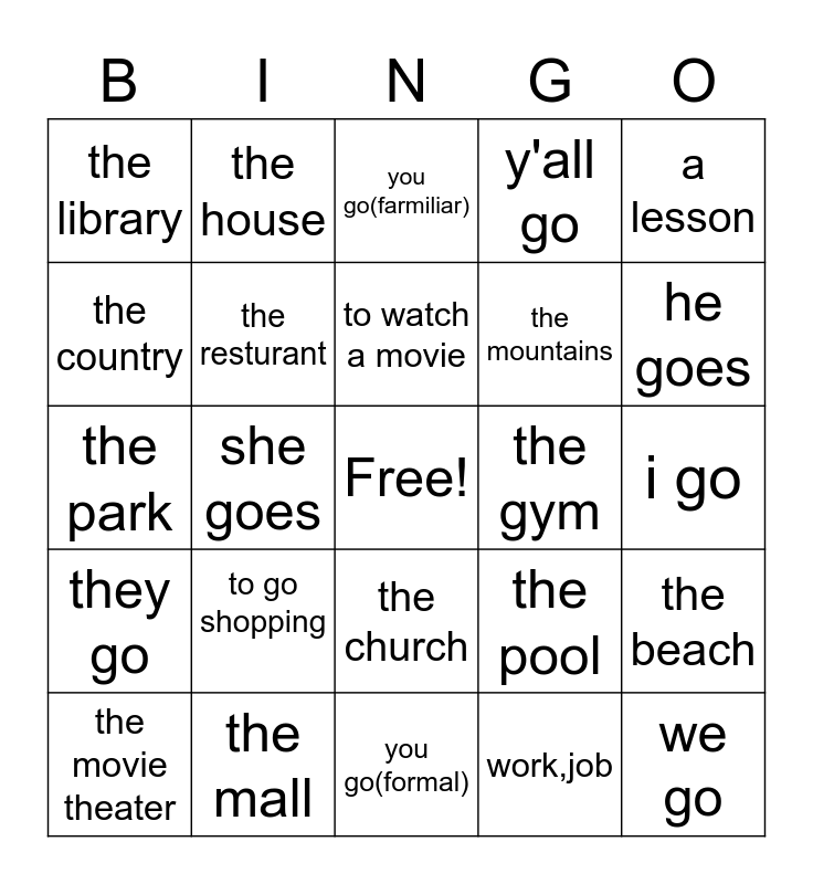 This bingo card has a free space and 24 words: to go shopping, the mall, to watch a movie, the movie theater, a lesson, the library, the country, the house, the gym, the church, the mountains, the park, the pool, the beach, the resturant, work,job, i go, you go(farmiliar), he goes, she goes, we go, they go, y'all go and you go(formal).