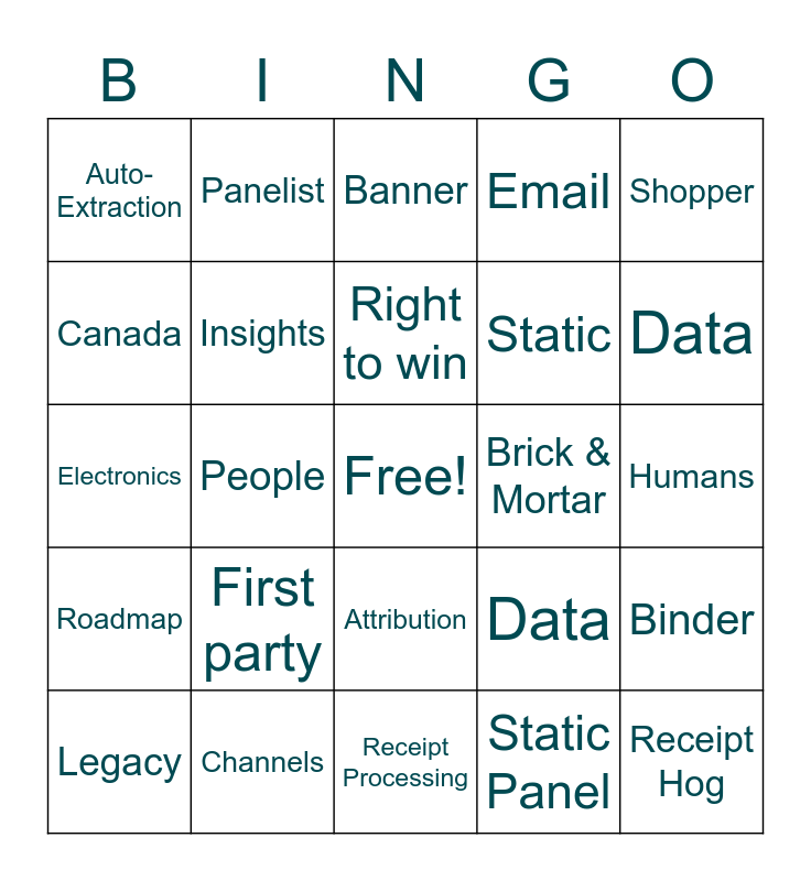 This bingo card has a free space and 31 words: Receipt Processing, Transcription, People, Rewards, Auto-Extraction, Banner, Insights, Data, Brick & Mortar, Static Panel, Humans, Receipt Hog, Insights, Consumer app, Data, Channel, Binder, First party, Roadmap, Attribution, Shopper, Channels, Legacy, Panelist, Static, Canada, Email, Electronics, Channels, Right to win and Transparent.