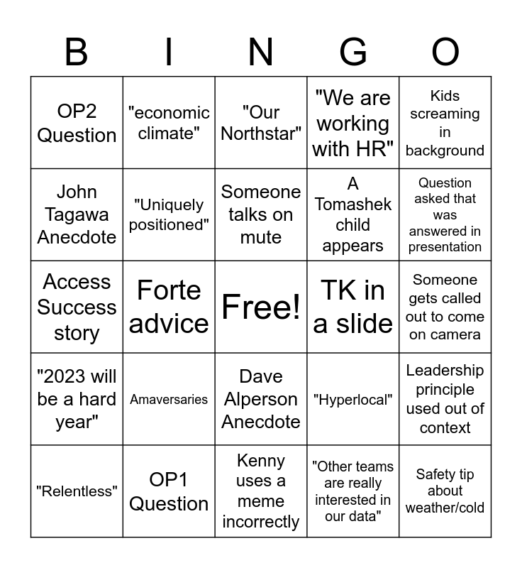 This bingo card has a free space and 24 words: Amaversaries, OP1 Question, Someone talks on mute, "Relentless", Kids screaming in background, OP2 Question, John Tagawa Anecdote, "economic climate", TK in a slide, Dave Alperson Anecdote, A Tomashek child appears, Access Success story, "Hyperlocal", Leadership principle used out of context, "Uniquely positioned", "Other teams are really interested in our data", Someone gets called out to come on camera, "Our Northstar", Question asked that was answered in presentation, Forte advice, Safety tip about weather/cold, "2023 will be a hard year", "We are working with HR" and Kenny uses a meme incorrectly.
