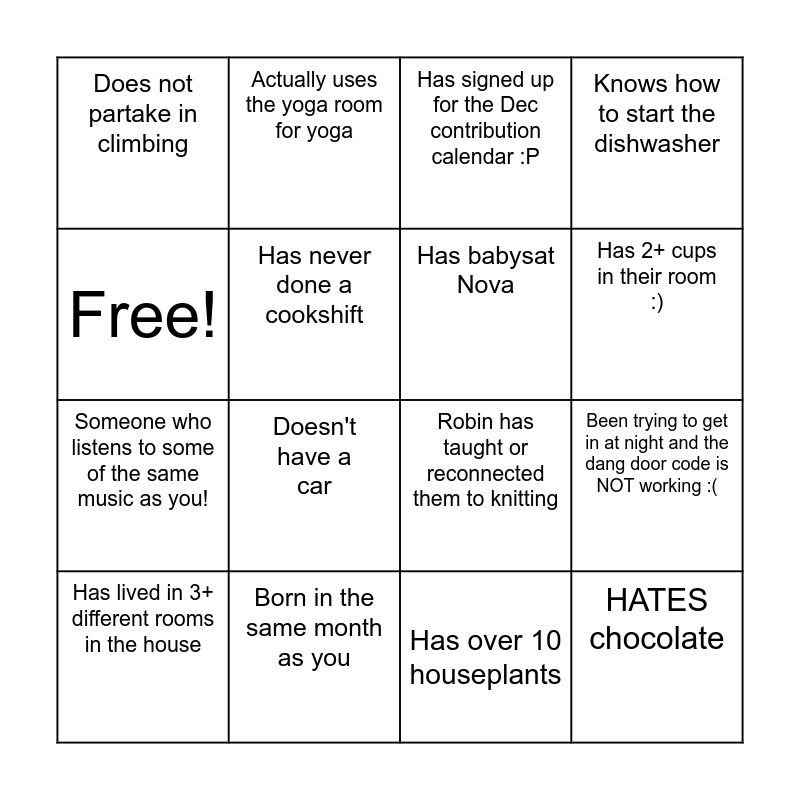This bingo card has 16 words: Born in the same month as you, Been trying to get in at night and the dang door code is NOT working :(, Has signed up for the Dec contribution calendar :P, Does not partake in climbing, Someone who listens to some of the same music as you!, Actually uses the yoga room for yoga, Robin has taught or reconnected them to knitting, Has over 10 houseplants, Free!, Has never done a cookshift, Has lived in 3+ different rooms in the house, Knows how to start the dishwasher, Doesn't have a car, Has 2+ cups in their room :), Has babysat Nova and HATES chocolate.