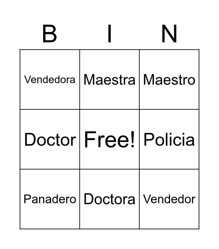 This bingo card has a free space and 8 words: Policia, Maestro, Maestra, Panadero, Vendedora, Vendedor, Doctor and Doctora.