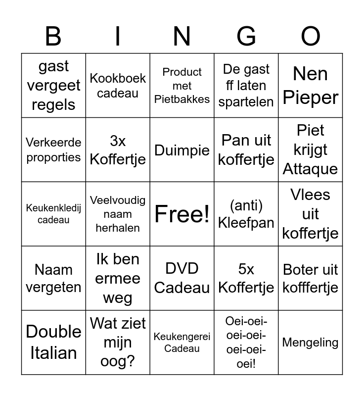 This bingo card has a free space and 36 words: "Toon een keer hoe da ge deraan begint", Ajuin, Look, 3x Koffertje, 5x Koffertje, Naam vergeten, Duimpie, Verstajet?, Nen Pieper, Piet IRL SFX, Veelvoudig naam herhalen, De gast ff laten spartelen, Wa-wa-wa-wa-wa., (anti) Kleefpan, Piet krijgt Attaque, gast vergeet regels, Eten ziet er ranzig uit, Ik ben ermee weg, Mengeling, Product met Pietbakkes, Vlees uit koffertje, Boter uit kofffertje, Wat ziet mijn oog?, Double Italian, Keukengerei Cadeau, Kookboek cadeau, Keukenkledij cadeau, Tyfus vreemd gerecht, Pan uit koffertje, Verkeerde proporties, Mislukte gerecht uit elkaar pulken, Gerecht is te droog, Oei-oei-oei-oei-oei-oei-oei!, DVD Cadeau, Eerste actie = FOUT and Piet's Party Trick.