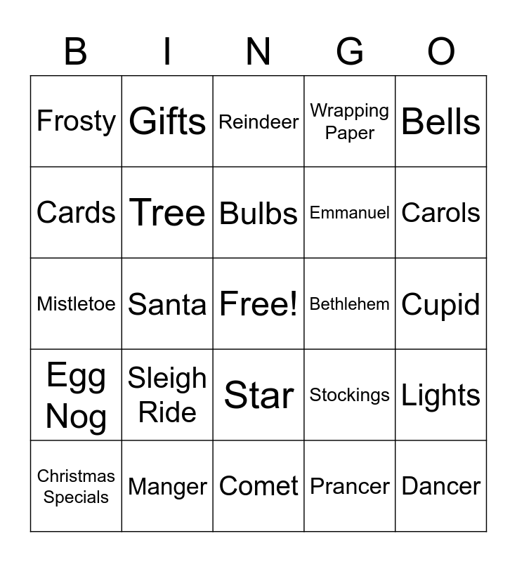 This bingo card has a free space and 30 words: Manger, Wise Men, Santa, Rudolph, Frosty, Reindeer, Tree, Star, Bethlehem, Comet, Cupid, Dancer, Prancer, Snowflake, Carols, Fireplace, Stockings, Egg Nog, Sleigh Ride, Bells, Mistletoe, Presents, Gifts, Emmanuel, Cards, Wrapping Paper, Lights, Christmas Specials, Bulbs and Christmas Vacation.