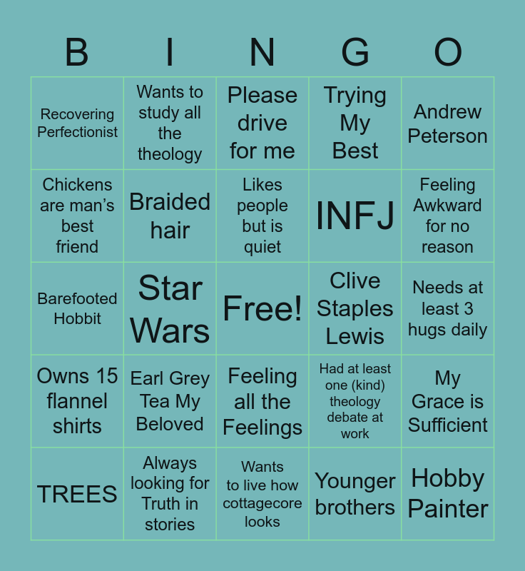This bingo card has a free space and 24 words: Earl Grey Tea My Beloved, Always looking for Truth in stories, Likes people but is quiet, TREES, Andrew Peterson, Recovering Perfectionist, Chickens are man’s best friend, Wants to study all the theology, Clive Staples Lewis, Feeling all the Feelings, INFJ, Barefooted Hobbit, Had at least one (kind) theology debate at work, My Grace is Sufficient, Braided hair, Younger brothers, Needs at least 3 hugs daily, Please drive for me, Feeling Awkward for no reason, Star Wars, Hobby Painter, Owns 15 flannel shirts, Trying My Best and Wants to live how cottagecore looks.