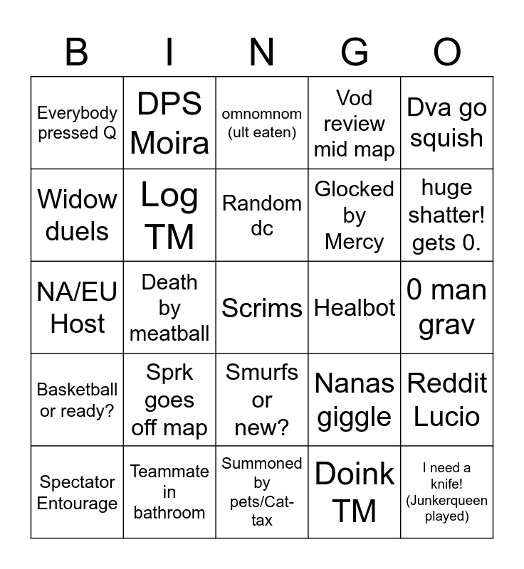 This bingo card has a free space and 24 words: Sprk goes off map, Teammate in bathroom, Random dc, Spectator Entourage, Dva go squish, Everybody pressed Q, Widow duels, DPS Moira, Healbot, Smurfs or new?, Glocked by Mercy, NA/EU Host, Nanas giggle, Reddit Lucio, Log TM, Doink TM, 0 man grav, omnomnom (ult eaten), huge shatter! gets 0., Death by meatball, I need a knife! (Junkerqueen played), Basketball or ready?, Vod review mid map and Summoned by pets/Cat-tax.