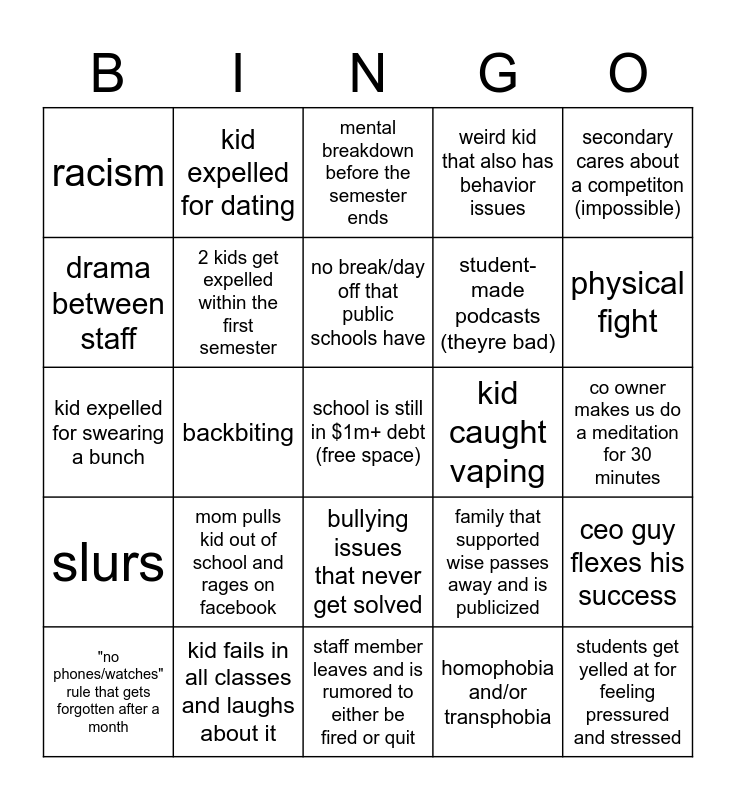 This bingo card has a free space and 24 words: "no phones/watches" rule that gets forgotten after a month, mom pulls kid out of school and rages on facebook, no break/day off that public schools have, homophobia and/or transphobia, secondary cares about a competiton (impossible), racism, kid expelled for dating, mental breakdown before the semester ends, kid caught vaping, co owner makes us do a meditation for 30 minutes, kid expelled for swearing a bunch, 2 kids get expelled within the first semester, family that supported wise passes away and is publicized, ceo guy flexes his success, drama between staff, kid fails in all classes and laughs about it, staff member leaves and is rumored to either be fired or quit, weird kid that also has behavior issues, physical fight, slurs, backbiting, bullying issues that never get solved, student-made podcasts (theyre bad) and students get yelled at for feeling pressured and stressed.