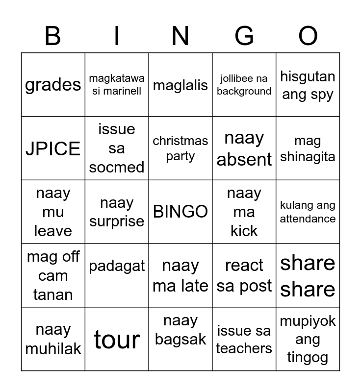 This bingo card has a free space and 24 words: padagat, tour, christmas party, naay muhilak, hisgutan ang spy, grades, JPICE, magkatawa si marinell, naay ma kick, naay ma late, naay absent, naay mu leave, react sa post, share share, issue sa socmed, issue sa teachers, kulang ang attendance, maglalis, mag shinagita, naay surprise, mupiyok ang tingog, mag off cam tanan, jollibee na background and naay bagsak.