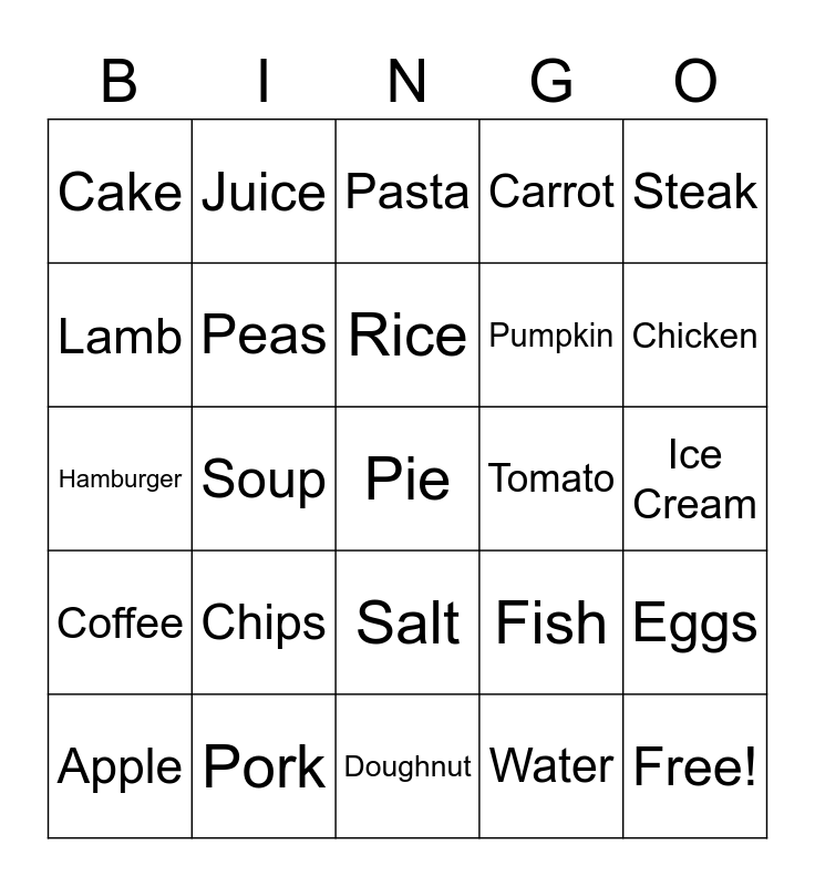 This bingo card has 34 words: Free!, Water, Coca Cola, Milk, Coffee, Peas, Steak, Apple, Juice, Broccoli, Rice, Pasta, Onion, Pepper, Tomato, Chicken, Pork, Hamburger, Chips, Fish, Salt, Banana, Cake, Ice Cream, Doughnut, Pie, Carrot, Potato, Pumpkin, Lamb, Pizza, Soup, Eggs and Bacon.