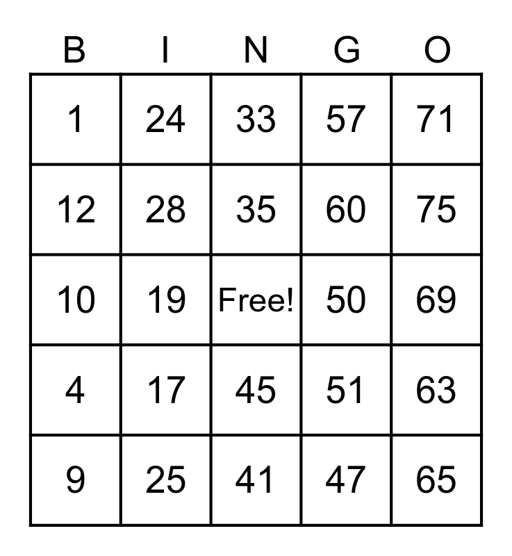 This bingo card has a free space and 24 words: 9, 17, 35, 47, 71, 1, 24, 33, 50, 69, 10, 28, 51, 63, 12, 25, 41, 57, 75, 4, 19, 45, 60 and 65.